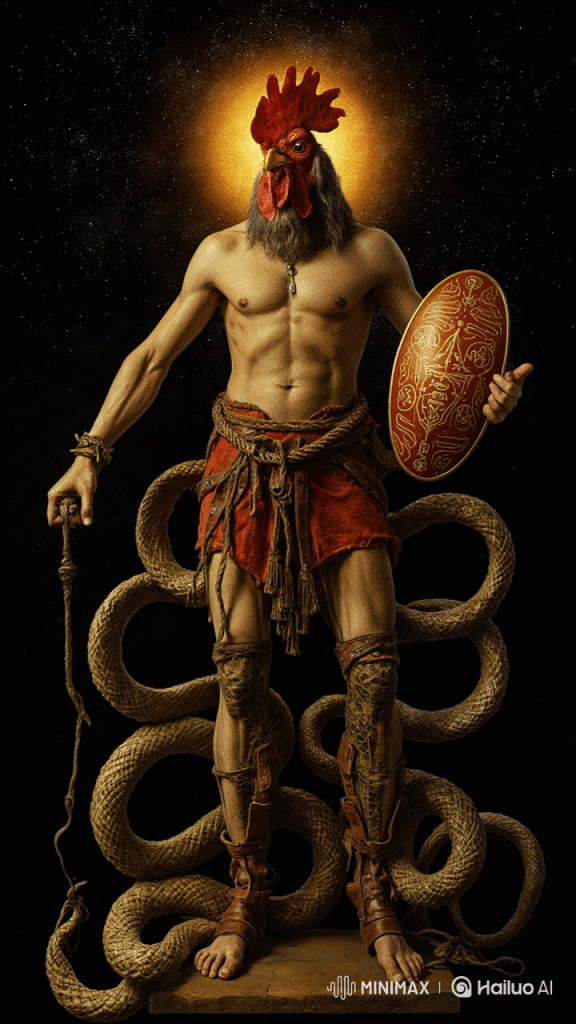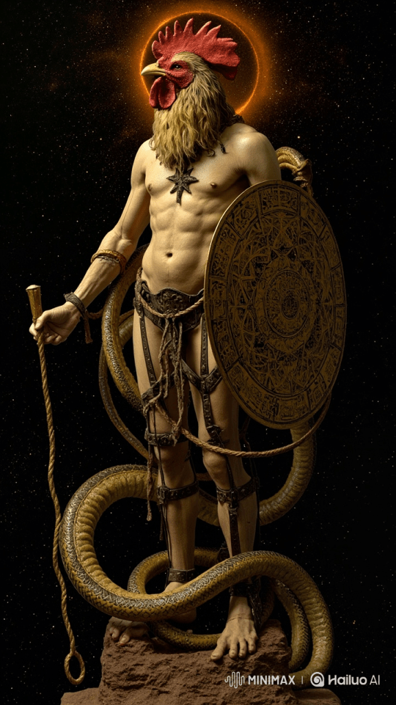 In the 2nd century AD, the early Gnostics personified the word as their Supreme Deity. Abraxas is symbolized on ancient talismans as the head of a cock on the body of a man with a whip in one hand and a shield in the other. The symbol is also engraved on gemstones called the Abrasax stones. (1)